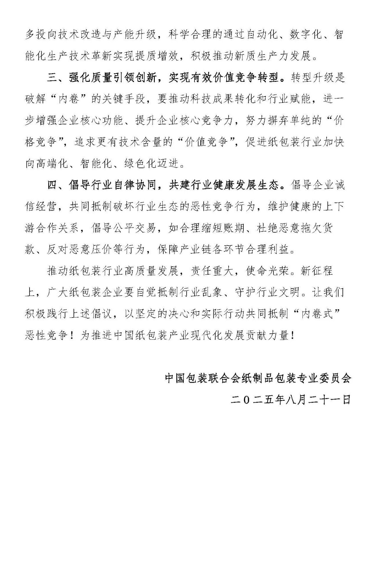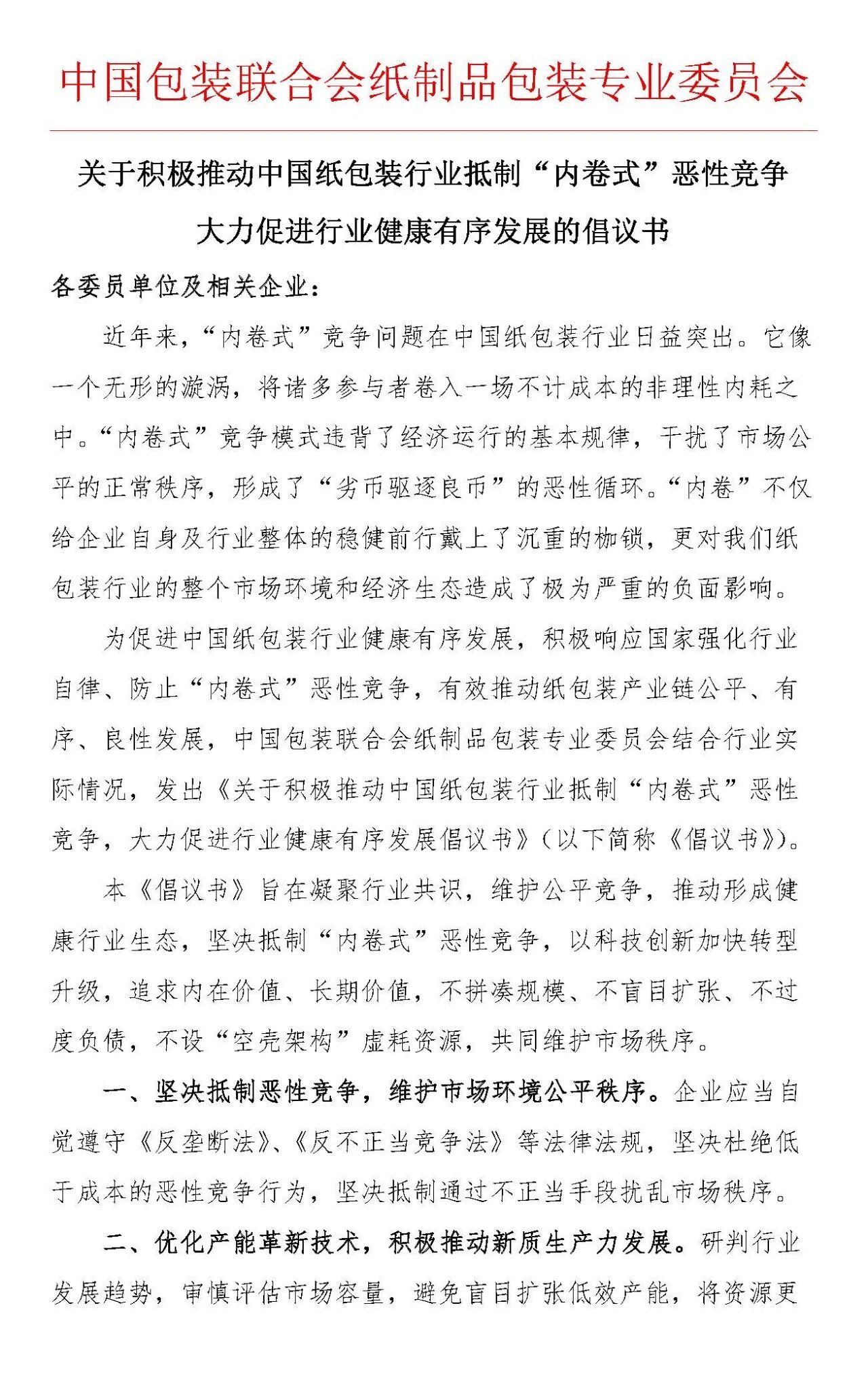 会议期间,中国包装联合会纸制品包装专业委员会张耀权常务副主任兼秘书长宣读了《关于中国纸包装行业抵制“内卷式”恶性竞争,促进行业健康有序发展的倡议书》。倡议书的发布,表明了业内对当前恶性竞争问题的深切关注,呼吁全行业采取行动,遏制“内卷式”竞争,推动行业走向更加健康、可持续的发展轨道。